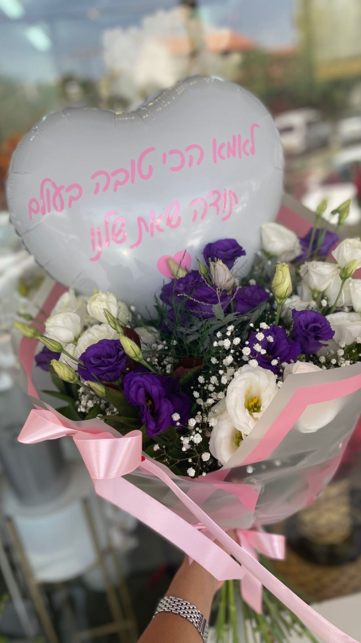 זר לבן סגול + בלון הקדשה – פרח באהבה